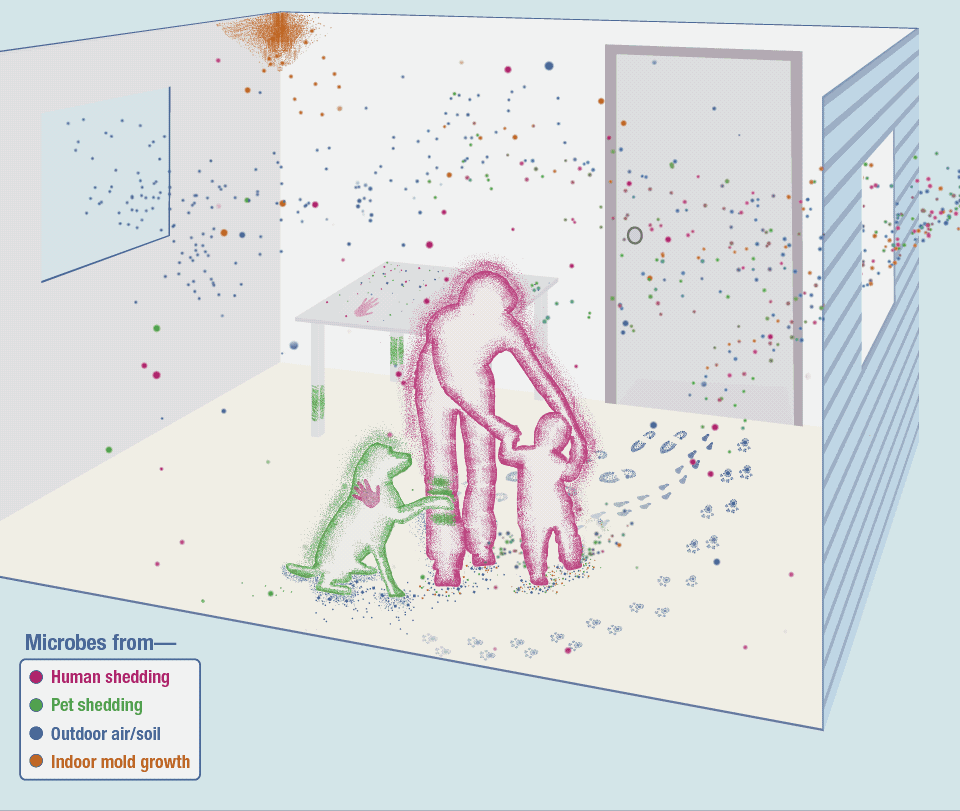 A presença de pet em casa é um fator determinante para a composição da microbiota do ambiente doméstico. Os animais de companhia são considerados promotores de mudanças significativas na composição microbiológica dos ambientes, causando alterações quantitativas e qualitativas na população de microrganismos da casa e das pessoas que possuem contato com os animais.